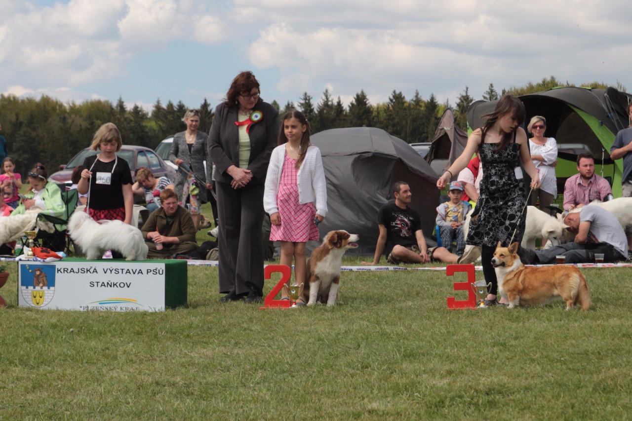 Dlouho jsme se rozhodovali ,zda někam pojedme po delší pauze na výstavu .Naštěstí nás Kačka přesvědčila ,že je to dobrý nápad,a tak jsme nakonec jeli s Broni a Kačenkou. Kam ?Po roce na krajskou vystavu.Broni byla přihlášená do třídy otevřene a Kačenka na juniorhandling.V obou částech převadělá Broni Kačka.Broni získala vítěze třídy ,krajského vítěze :-) a užadný posudek od zkušeného a přísného pana rozhodčího MVdr Šimka.Kačenka poté vybojovala v Juniorhandlingu (9-13 let) krásné 3. místo ze 13 učastníků.Od paní rozhodčí Štahlové děti dostali i pár rad , co a jak zlepšit.Bonusem bylo ,že jsme se potkali s dalšími třemi corgi a jejich páníčky.